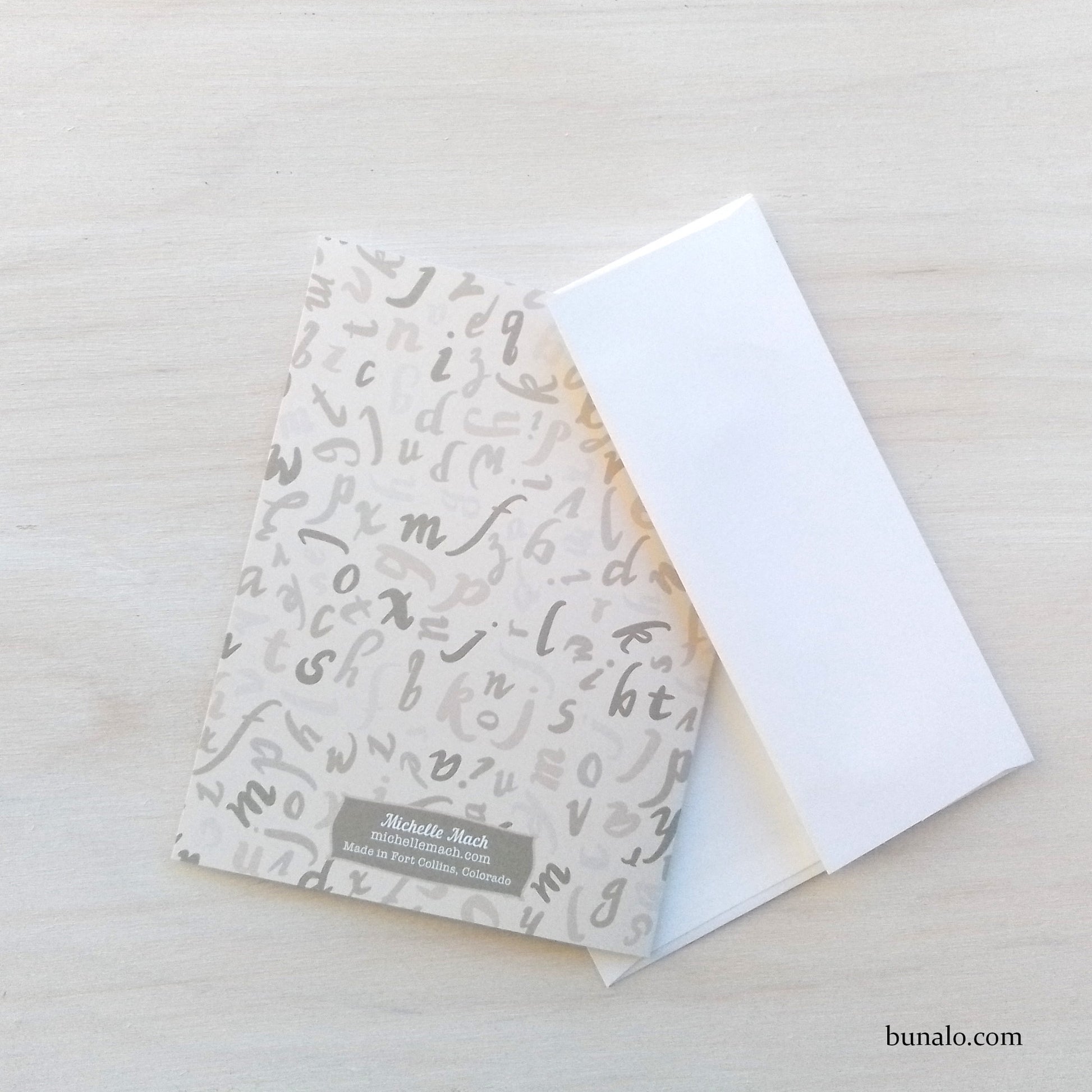Love to write? This small greeting card features my original lettering -- all the letters of the alphabet in my unique calligraphy style! I've used a neutral beige color for an understated, elegant look suitable for thank you notes or everyday correspondence. It's an especially nice design for someone who loves words and letters. The pattern is on the front and back of the card.