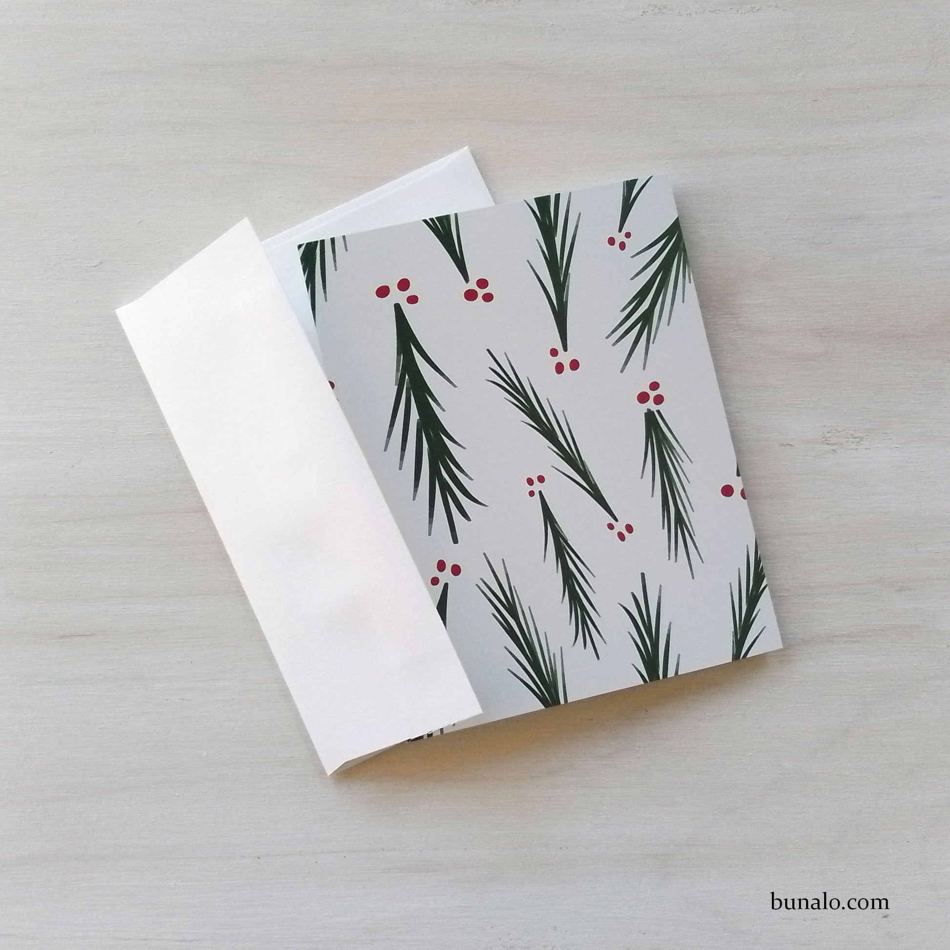 This small greeting card features my original Christmas holly illustration. I've made two versions, one with a traditional red and green color palette, the other in a more trendy pink and green. The pattern is on both the front and back of the card.